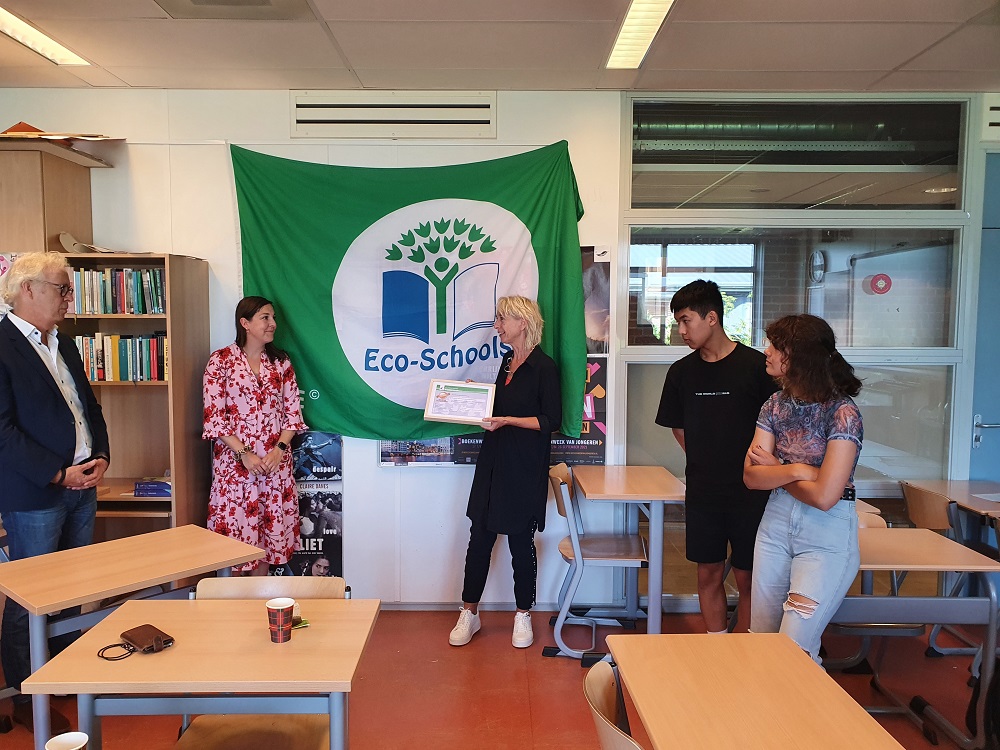 - betrekt studenten: het ecoteam komt regelmatig bij elkaar. Daarnaast wordt in de lessen Nederlands (haar eigen vakgebied), biologie en aardrijkskunde (de andere twee Ecoteamdocenten) veel aandacht besteed aan milieu en klimaat in de vorm van het project Duurzaamheid en eigen vaklessen